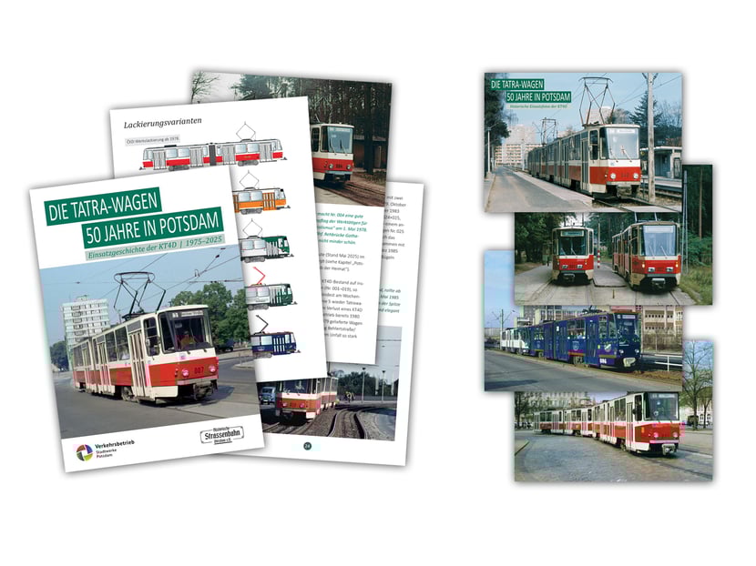 Pünktlich zum 50 Jubiläum des ersten Fahrgasteinsatzes der KT4D in Potsdam, haben wir eine Broschüre und ein Postkartenset aufgelegt.