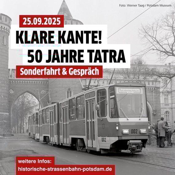 Das Potsdam-Museum, die ViP Verkehrsbetrieb Potsdam GmbH und der Verein Historische Straßenbahn Potsdam e.V. laden am 25.09.2025 zu Sonderfahrt und Gespräch über 50 Jahre Tatrawagen in Potsdam.
