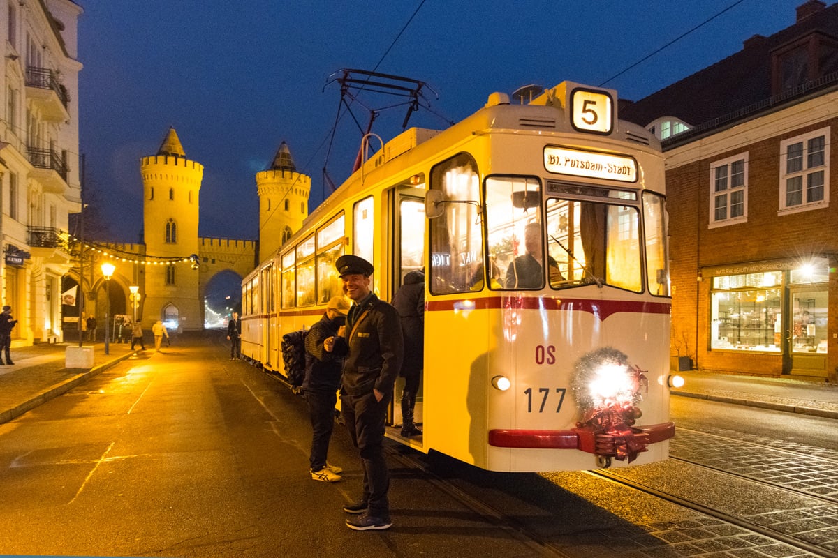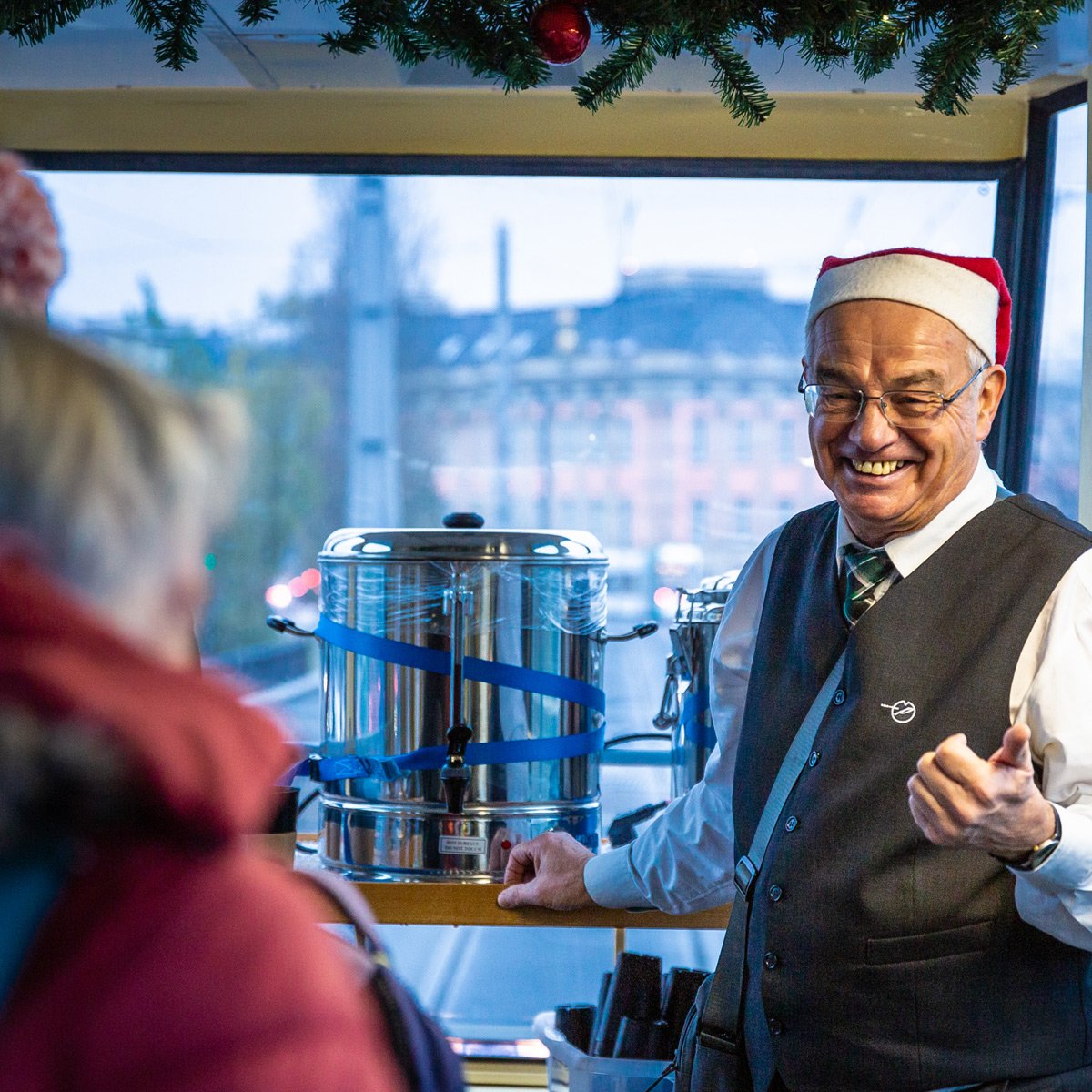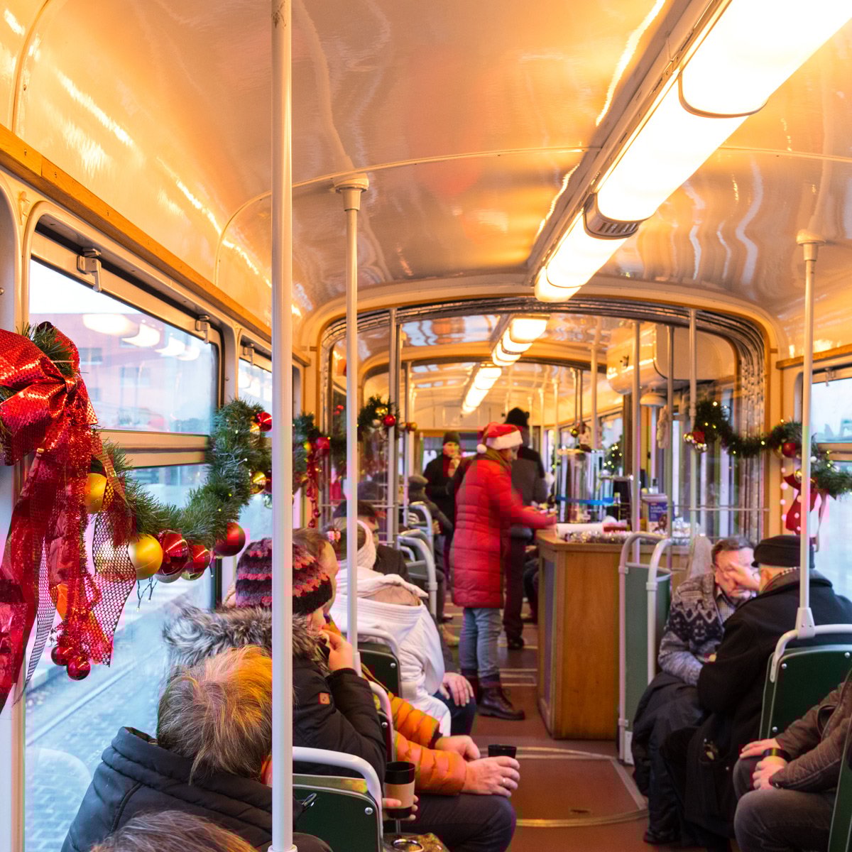 Herzlich Willkommen in unseren festlich geschmückten historischen Straßenbahnen.
